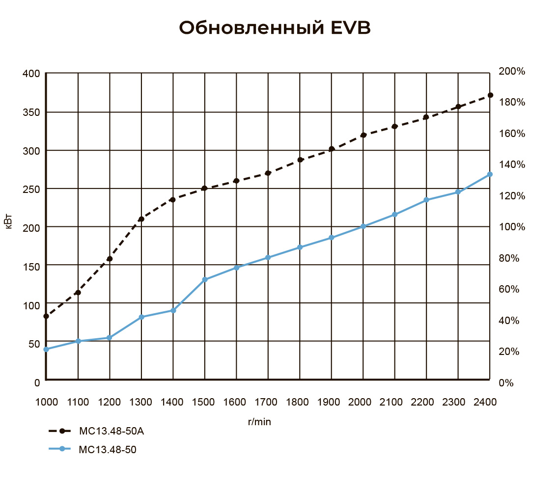 Его мощность увеличена с 270 до 370 кВт и прибли жается к мощности гидравлического замедлителя (400 кВт). Более того, новый EVB на низких оборо тах (от 1000 до 1400 об/мин) эффективнее прежнего на 100–178%.